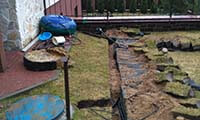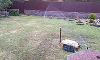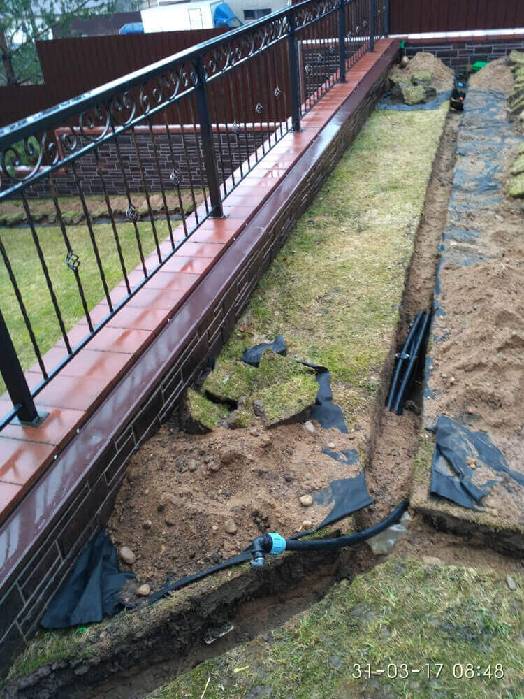 Согласно проектному решению система автополива на данном участке состоит из 5 зон, которые работают последовательно. Поскольку автополив запитан из скважины, то установлен мелкодисперсный фильтр для очистки воды от мелкого песка, который может поступать вместе с водой. Монтаж производился ранней весной. Во время проведения работ выпал небольшой снег, что несколько осложнило работу с газоном. Газон сильно увлажнился и тяжело укладывался. Несмотря на это работы были выполнены в срок 3-х дней. Газон при этом не пострадал (результат на фото). После укладки остались еле заметные швы, которые после третьего покоса газона уже были не видны.